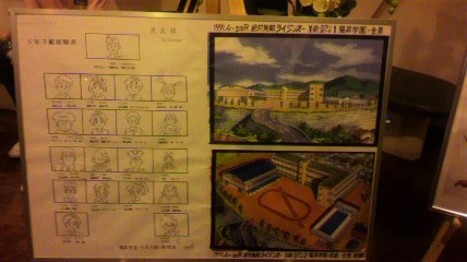写真は、番宣ポスターの原画と美術ボード(学校の全景と座席表)、トークイベント中に行われたプレゼント大会での景品の色紙。
